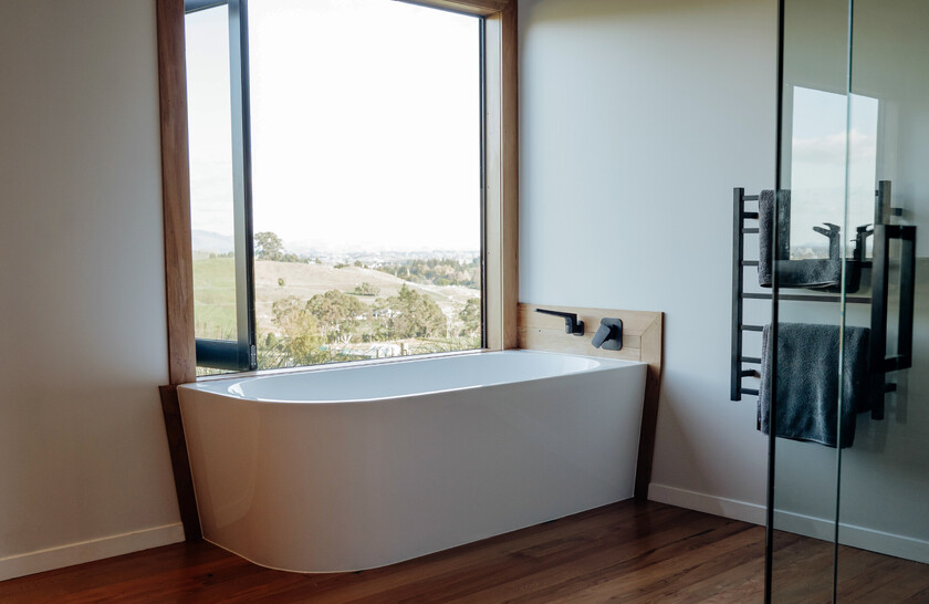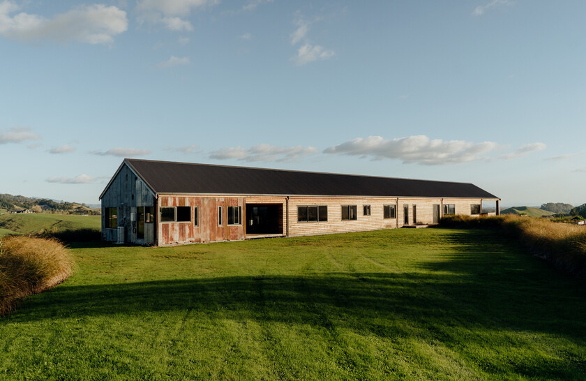 The house has been clad in horizontal bevel-backed Marcocrpa, and recycled galvanised corrugate iron sourced from many old woolsheds and barns. Designed to settle in with existing farm buildings in a prominent position on the knoll overlooking their farm and greater Waikato basin. Spectacular views are enjoyed from every nook, with the best from the portico and believe it or not the walk-in shower!