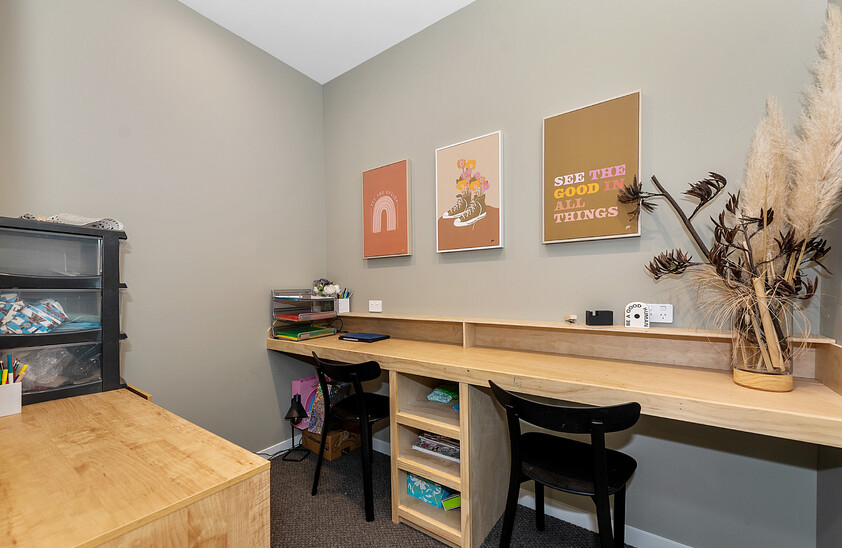The interior features a large central living room and kitchen with raked ceiling, opening out onto the patio. Four bedrooms, bathroom, ensuite, office and study nook, and second living room. Budget $650,000